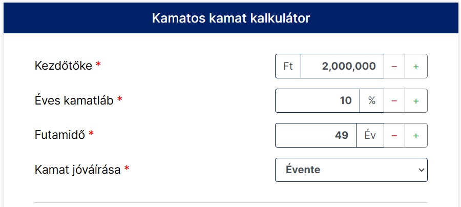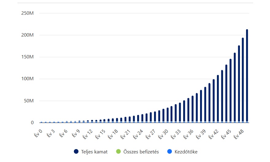 Sajnos jól látod... 49 év kell ahhoz, hogy a jóindulatú 10% éves kamattal elérd a 200 000 000 Ft tőkét, DE nyilvánvalóan az infláció miatt nem lehet majd 49 év múlva ennyiért lakást venni. 🙁